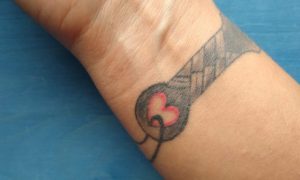 The tattoo is on my wrist. (Apparently finger tattoos wear off quickly so it’s not recommended.) There are three pink hearts on the paddle and one small pink heart on the handle. It’s about love. Love for the people in my life, for people yet to enter my life, and a reminder that love will come unexpectedly, not from where you think. That middle heart is facing the opposite direction. The small heart on the handle is a reminder of loved ones not in your life anymore. Maestro incorporated the three heart design into his fifth tattoo, a fully charged battery on his chest.
